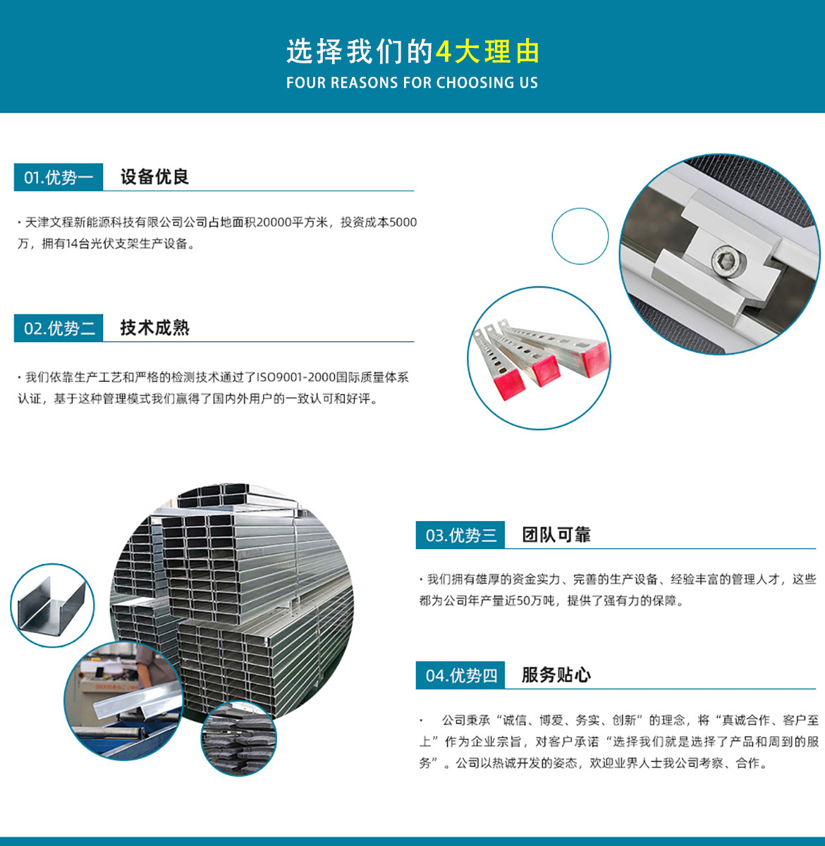 天津文程新能源科技有限公司成立于2021年,是專注于集中式、分布式、漁光互補(bǔ)和農(nóng)光互補(bǔ)等清潔能源發(fā)電的綜合性企業(yè) 公司是集設(shè)計、研發(fā)、生產(chǎn)、制造為一體的綜合型企業(yè)。公司占地面積20000平方米,注冊資金5000萬元整。公司坐落于華北鋼鐵重鎮(zhèn)--大邱莊,距天津市區(qū)50公里、鄰104和205國道及京滬高速,交通十分便捷。 本公司擁有三個生產(chǎn)車間,其中兩個冷彎型鋼車間,一個鋅鋁鎂型鋼車間,擁有自動冷彎成型機(jī)10條,自動數(shù)控沖孔機(jī)10條以及焊接加工等設(shè)備。主要生產(chǎn)產(chǎn)品有:太陽能光伏支架、各種規(guī)格的C/Z/U型鋼、抗震支架、管廊支架及整套配件等。
